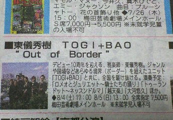 せいやさん、おはようございます。 東儀さんも10周年。そして、あらゆる境界を越える人なんですね。益々、剛くんとの縁を感じますよね。 私も、東儀さんのライブってちょっと見てみたいなあって思います。すごく、癒されそうな気がする。雅楽って「宇宙」「空」「地面」を現してるというスケールの大きな音楽っていうところに、ちょっと惹かれます。 友達とも言ってたんだけど、東儀さんとケリーのコラボのときに、大平さんのメガスターの星を見てみたいね~って。 すごくマッチしそう~。 せいやさん、梅田に行っちゃいますか?
