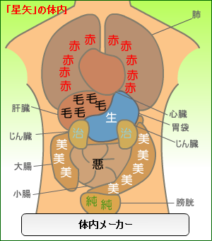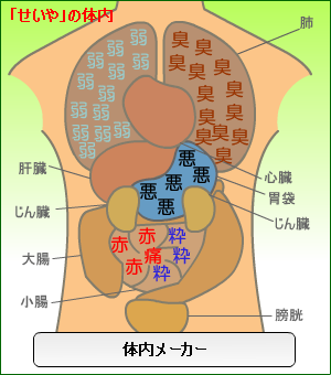 体内メーカーが流行ってるらしい。 せいやの体内は・・・ らしいです(笑) ちなみに、本名でやってみると、肺が「怠」、「臭」で、胃が「無」らしいです。 せいやの体内は、相当、たちの悪い臓器が潜んでると思われます・・・(笑) これで、心臓に「毛」が生えてたら、面白い結果になったのにな~。 腸と、膀胱だけ優秀なのが救いかな。 やはり、女性はココのトラブルが多いからね・・・って何の話やねん!
